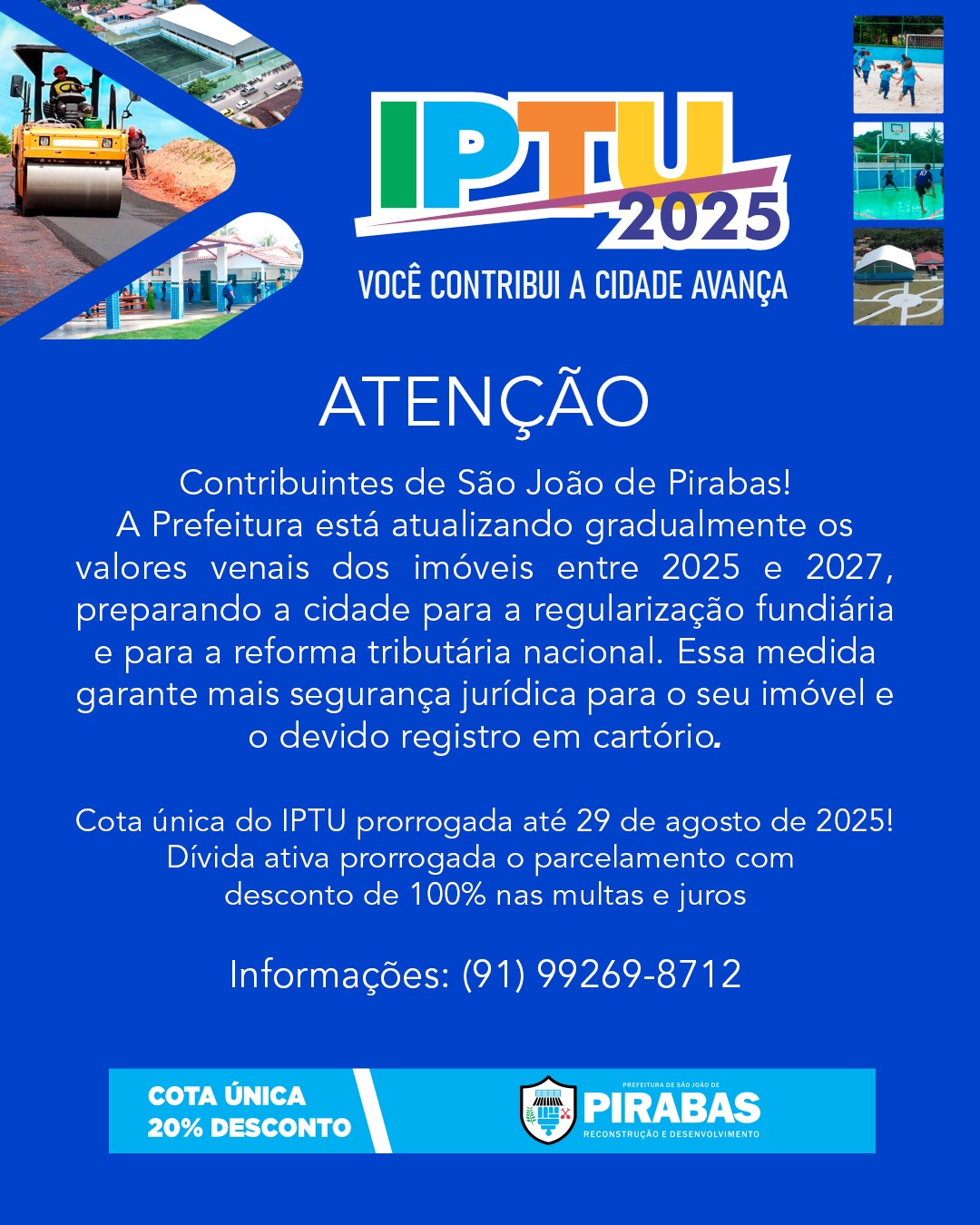 – Cota única do IPTU prorrogada até 29 de agosto de 2025 com 20% de desconto!